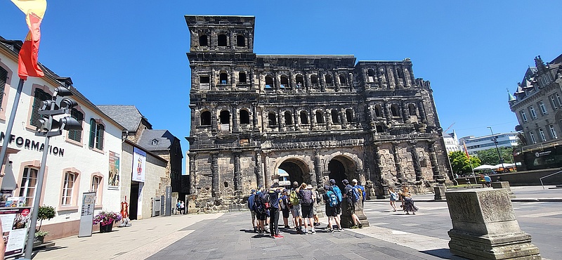 Am Montag heißt es dann „Auf nach Trier!“ In der ältesten Stadt in Deutschland angekommen beginnen die Kirchheimer ihre Erkundung mit einer Stadtführung an der römischen Porta Nigra, das wohl älteste noch erhaltene Gebäude in Deutschland. Bei sonnigen 32°C im Schatten erfahren die Junghelfer:innen von ihren beiden Stadtführer allerlei interessantes, wissenswertes und auch kurioses rund um die römischen Bauwerke und ihre Reise durch die Trierer Stadtgeschichte. So genießen die Junghelfer:innen den Ausblick von der obersten Ebene der Porta Nigra über Trier, sind verblüfft über den Unterschied der ordentlichen Mauerreste der Römer zu den eher chaotisch zusammengeflickten Erweiterungen im Mittelalter, blicken ehrfurchtsvoll in das gigantische Deckengewölbe der Konstantinbasilika die als Thronsaal für den römischen Kaiser Konstantin diente und erkunden auf eigene Faust die verwinkelten Gänge und kühlen Kellergewölbe der Kaiserthermen.