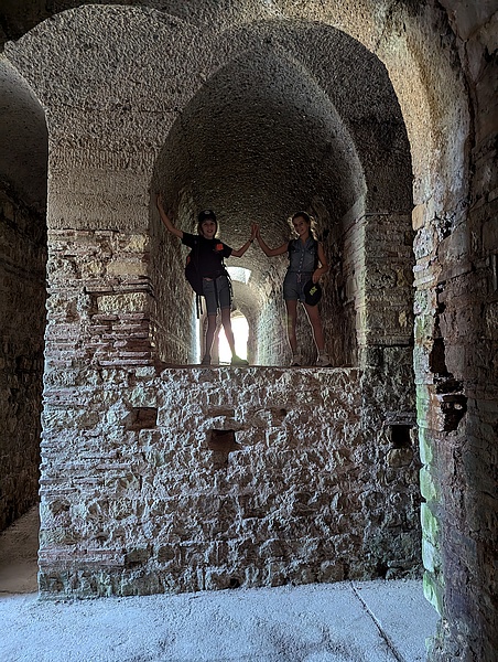 Nachdem sich alle ausgiebig gestärkt haben, geht es zur zweiten Überraschung. Eine Führung mit dem Gladiator Valerius im Amphitheater das etwas außerhalb steht. Sie beginnt in den kühlen, nur mit Fackeln beleuchteten Katakomben unterhalb der Kampfarena mit einer kleinen Präsentation. Dass der eigentlich versprochene Gladiator zunächst fehlt, fällt den sichtlich erschöpften Junghelfer:innen zunächst überhaupt nicht auf. Ein leichtes Spiel für Gladiator Valerius der mit seiner Fackel und Umhang plötzlich aus einem dunklen Gang mit einem markerschütternden Schrei unter die Junghelfer:innen fährt und die ganze Gruppe aus ihrer essenbedingten Lethargie reißt.