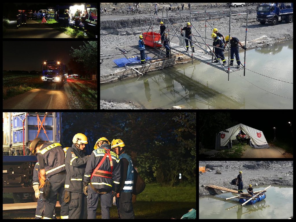 Auf dem Hof herrscht beim Einrichten des Feldlagers in den Fahrzeughallen emsiges Treiben, als es plötzlich heißt „Alarm, die Gemeinde Ohmden ist von der Außenwelt abgeschnitten.“ Die Wassermassen der letzten Nacht haben den Trinkbach so anschwellen lassen, dass er die einzige Brücke nach Ohmden weggespült hat. Bis die Fachgruppe Brückenbau eintrifft und eine provisorische Autobrücke bauen kann, muss die Bevölkerung über kleinere Stege zu Fuß versorgt werden. So die angenommene Einsatzlage.