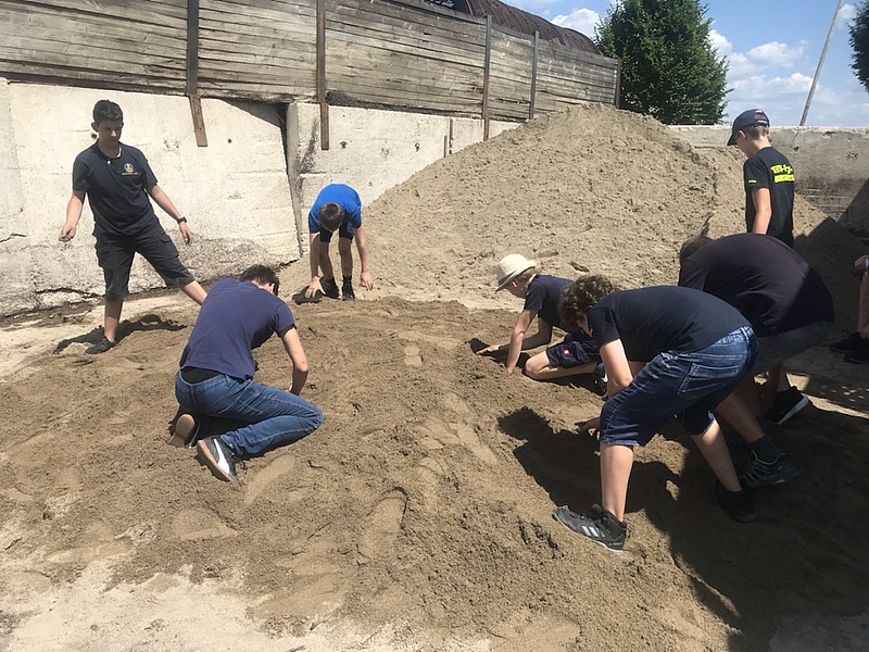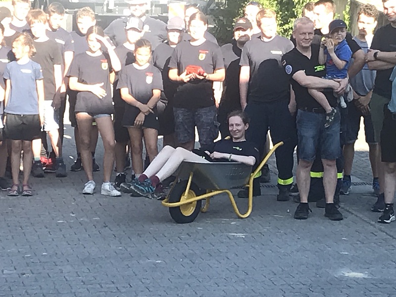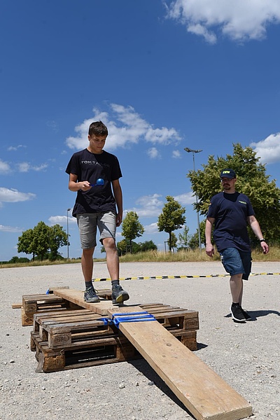 Und dann geht es los. Alle 15 Minuten startet eine Wettkampfgruppe in den Stationslauf. Bei der 1. Station auf dem Gelände der Firma Döbler müssen in einem gigantischen Sandhaufen so viele Münzen wie möglich gefunden werden. Weiter geht es über den Parkplatz an der Hahnweide, auf dem es gilt einen Parcour zu durchlaufen, hin zum Wendepunkt auf dem Firmengelände der Firma Waggershauser, wo ein Schubkarren ohne Anleitung montiert werden muss um damit einige Hindernisse zu bewältigen, so sind etliche Stationen zu bewältigen.