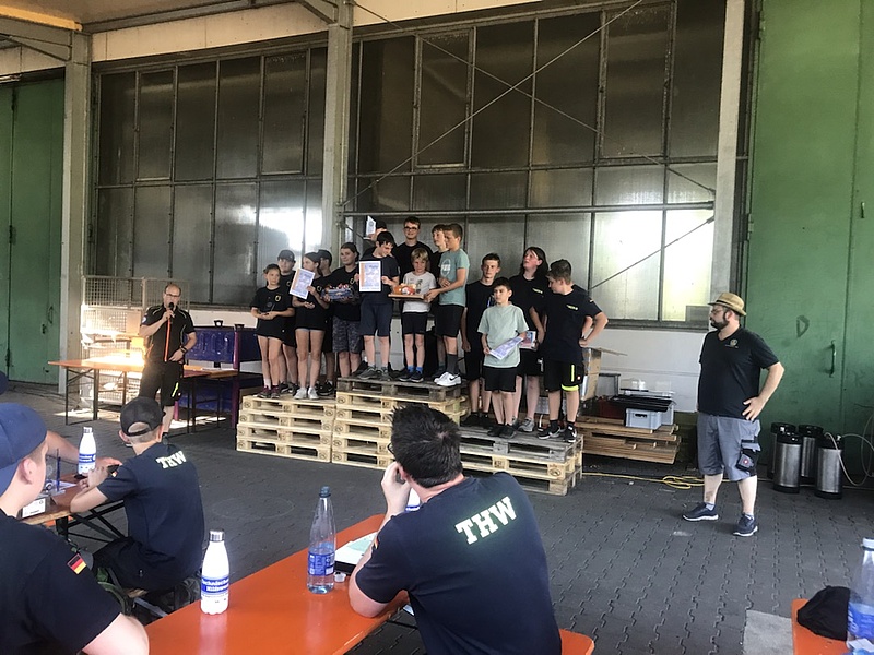 Dann wird es bei der Siegerehrung noch einmal spannend. Gebannt warten die Teilnehmer:innen darauf, dass Alex die Gewinner verkündet. Verdient erkämpft haben sich den 3. Platz die THW-Jugend Göppingen 1 mit 1044 Punkten und gewinnt damit 100 Wassereis. Den 2. Platz erringt die Jugendfeuerwehr Beuren und gewinnt mit 1285 Punkten einen Filmeabend mit Spagetti essen. Auf einen Filmeabend und dazugehörendem Vesperpaket können sich die Jugendlichen der THW-Jugend Göppingen 2 freuen, die mit 1330 Punkten den 1. Platz an diesem Wettkampftag erreicht.