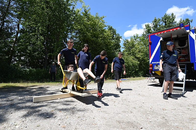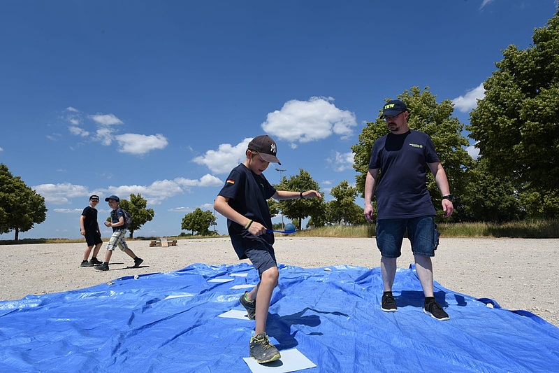 Bis zur Siegerehrung bewältigen fast alle Wettkampfgruppen 10 Stationen und 13 Zusatzaufgaben auf einer Strecke von 7km Länge. Zurück an der DEULA können sich die erschöpften Junghelfer:innen und Betreuer:innen mit Wurst vom Grill, Eistee und bei der Hitze mit dem bei allen beliebten Eis stärken und sich die Wartezeit bis zur Siegerehrung mit der extra aufgebauten THW-Hüpfburg und weiteren Spielen auf dem Hof vertreiben.