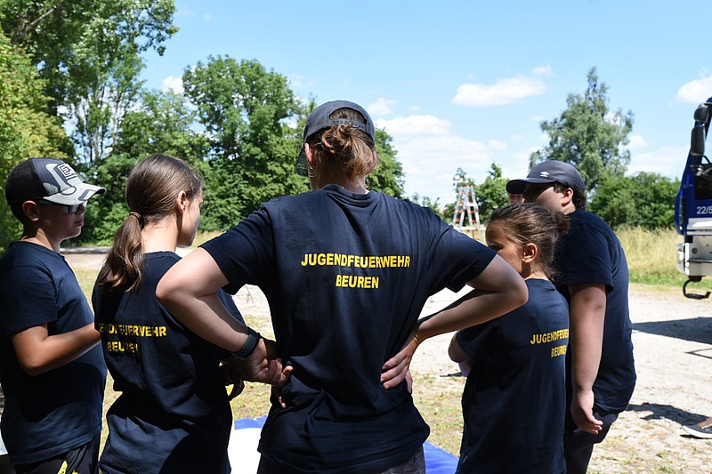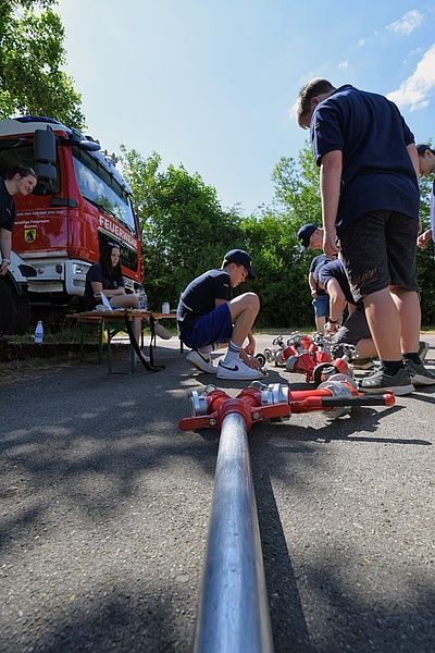 Aber noch ist kein Ende in Sicht. Auf dem Rückweg zum Endpunkt warten auf die Jugendgruppen sieben weitere Stationen, an denen Aufgaben mit Geschick, Logik und manchmal auch ein wenig Glück gelöst werden müssen. Auch die letzte Station der Jugendfeuerwehr Beuren hat es in sich. Aus zwei Hydranten und allen Armaturen aus dem mitgebrachten Löschfahrzeug muss eine möglichst lange Strecke gebaut werden.