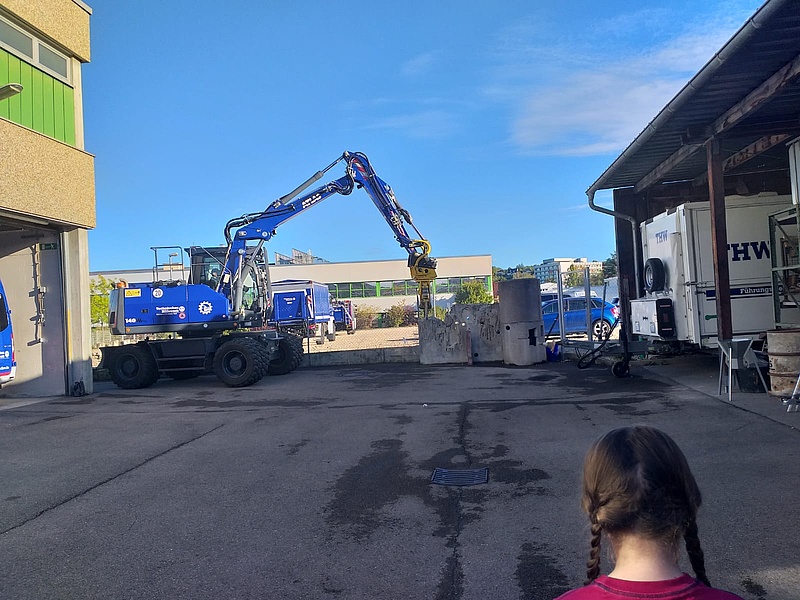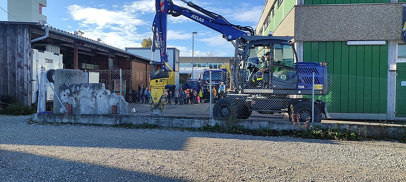 Die Begeisterung der Minis ist nicht zu überhören als Betreuer Olli verkündet: „Wir gehen jetzt nach vorne auf den Hof zum Bagger!“ Dort angekommen wird Räumen-Gruppenführer Tobi über alle Einzelheiten des Baggers ausgefragt und erklärt geduldig jedes noch so kleine Detail. Der absolute Höhepunkt des Tages kommt, nachdem die zwölf unterschiedlichen Funktionen des Baggers mitgezählt sind und alle einmal im Bagger Probe sitzen dürfen. Ganz ruhig wird es plötzlich auf dem Hof. Gebannt verfolgen die Minis wie Baggerfahrer Tobi mit der Baggerschere einige Teile aus der 20cm starken Übungswand aus Beton abbeißt und auf dem Hof zerkleinert. Und natürlich dürfen sich alle ein Stück zerbröselte Wand als Andenken mit nach Hause nehmen. Wie einst in Berlin, denkt sich der eine oder andere zuschauende Erwachsene und schmunzelt.