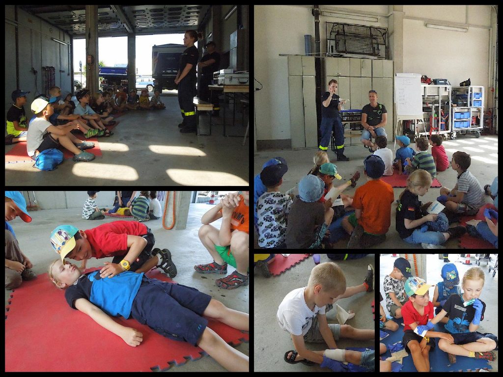 Da der strahlende Sonnenschein bereits am Morgen den Hof auf Höchsttemperaturen aufheizt verzieht sich die Gruppe nach dem Antreten und dem ersten Gruppenspiel in die kühle Fahzeughalle. Dort wird ein unvorsichtiger Papa immer wieder zum Opfer von Ausbilderin Franzi um das richtige versorgen von Verletzungen zu zeigen.