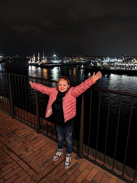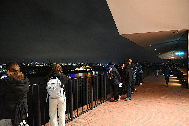 An der Hamburger Elbphilharmonie angekommen verkündet Betreuer Olli: „Und da fahren wir jetzt rauf!“ Die Überraschung ist geglückt, mit der längsten gebogenen Rolltreppe Europas geht es auf die Aussichtsplattform der Elphi in 37,5 m Höhe mit weitem Blick über den nächtlichen Hafen von Hamburg und die Hamburger Stadt.