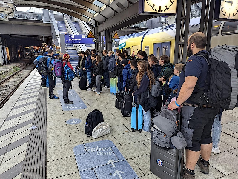Nach so vielen Erfahrungen heißt es dann am Freitagmorgen Abschied nehmen und mit dem ICE wieder zurück nach Hause. Auch wenn es kurzzeitig so ausgesehen hat, als würde der Heimweg mit dem ICE wegen einer Streckensperrung in Frankfurt enden, geht dann doch alles gut. Die Gleise sind wieder frei und die Junghelfer:innen und ihre Betreuer:innen kommen planmäßig in Stuttgart an und sind dann schließlich sogar 30 Minuten früher als geplant in Kirchheim unter Teck.