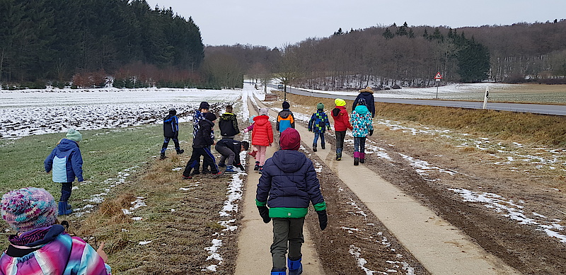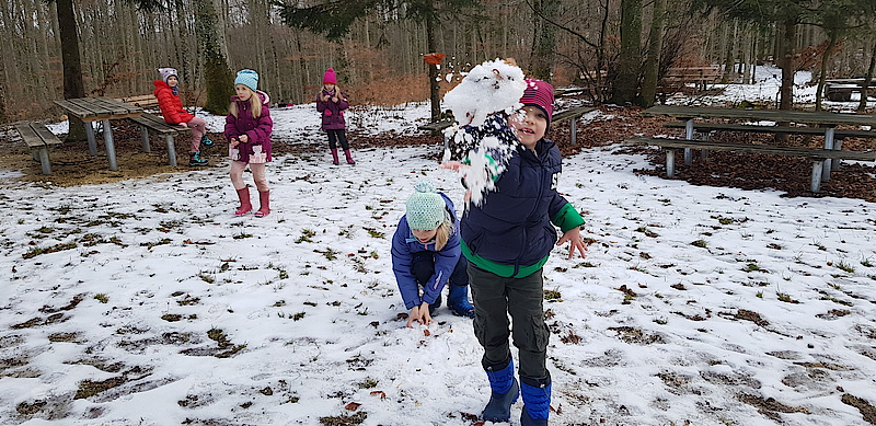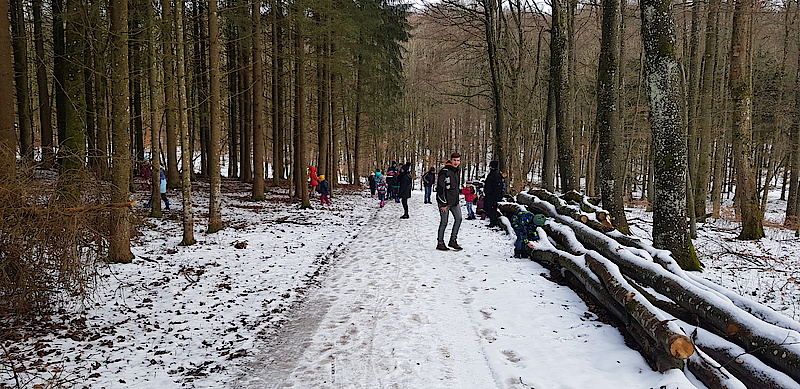 Nachdem sich alle ordentlich gestärkt haben und alle Geschenke in Sicherheit gebracht sind, geht es endlich nach draußen. Schon nach einem kurzen Fußmarsch ist der heiß begehrte Schnee dann endlich gefunden. Kurz darauf befinden sich alle Jugendbetreuer in einem nicht endend wollenden Kreuzfeuer aus Schneebällen.  Nur am Fuße des Römersteinturms gerät die Schneeballschlacht für einen kurzen Moment beim Anblick der riesigen und doch so raren unberührten Schneefläche kurz ins Stocken. Nach einem kurzen Moment der Begeisterung geht es fleißig weiter. Es ist sogar so viel Schnee vorhanden, dass es für drei Schneemänner reicht. Nachdem sich alle richtig ausgetobt haben und sogar ein kleines Feuer in der Feuerstelle entzündet werden konnte, geht es wieder auf den Rückweg.