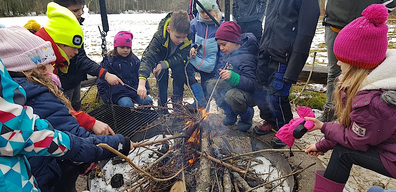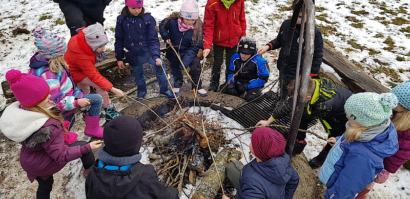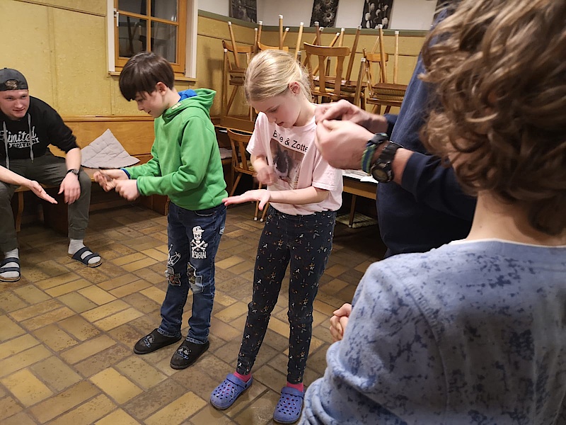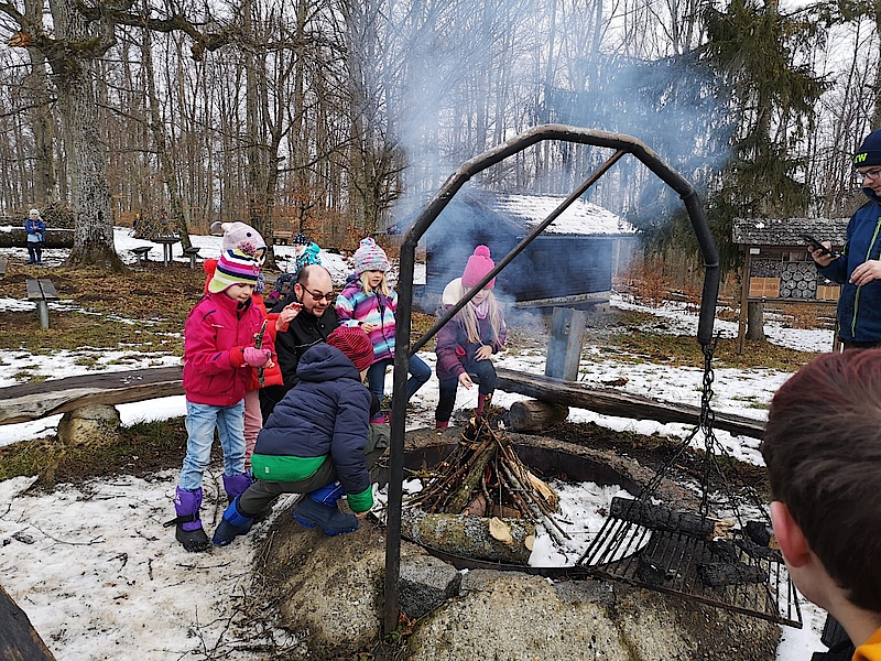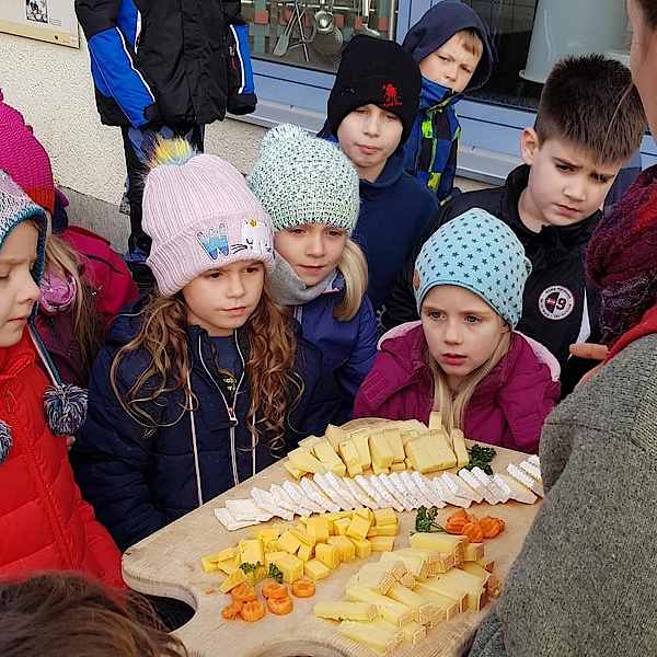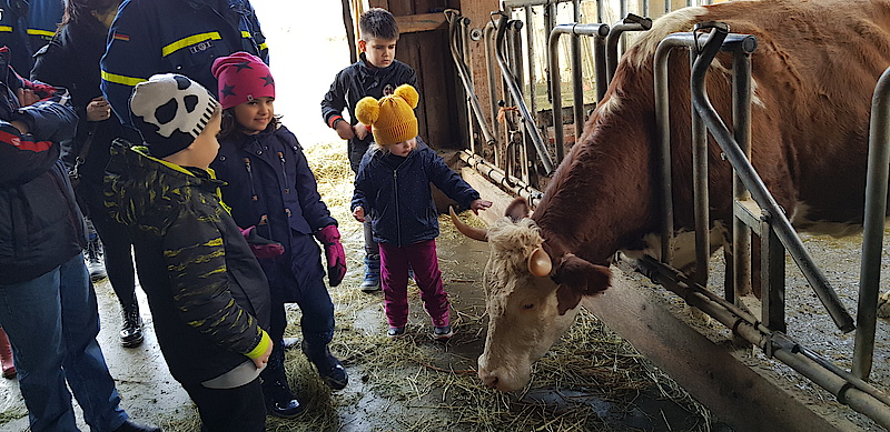 Damit nach dem Mittagessen keine Langeweile aufkommt geht es zum Bauernhof Ziegelhütte. Dort stehen die beeindruckten Minis einigen Milchkühen Auge in Auge gegenüber und manch mutiger macht auch die Bekanntschaft mit der rauen Zunge der neugierigen Tiere. Danach folgen die Minis dem Weg der Milch vom Melkstand bis hin in die Käserei, wo jeder den selbstgemachten Käse auf dem Hof probieren darf. Den ereignisreichen Tag lässt die Gruppe dann mit einem Filmabend ausklingen.