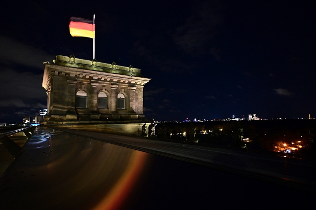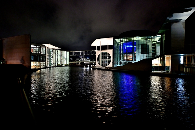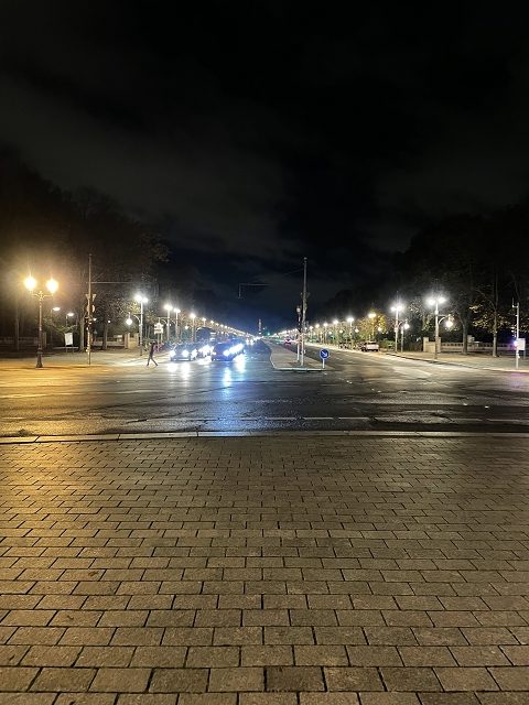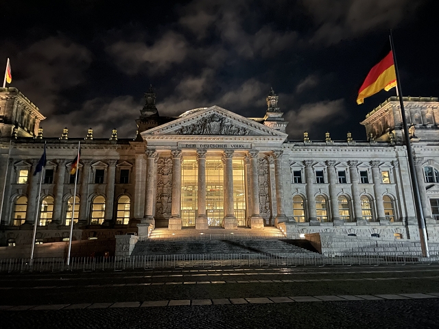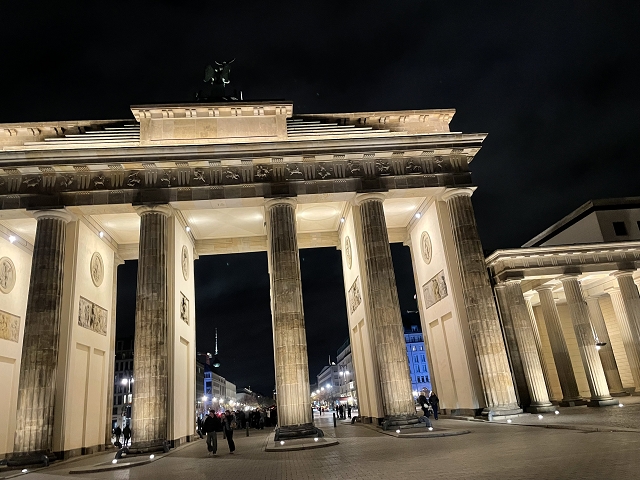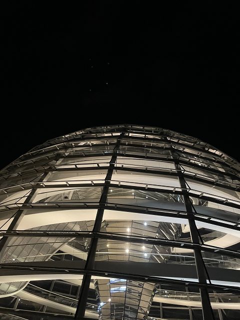 In Berlin angekommen, führte die S-Bahn und ein kurzer Fußmarsch zum Hotel. Nachdem die Zimmer bezogen und beim Abendbuffet neue Kräfte gesammelt waren, stand schon der erste Ausflug an. Im Regierungsviertel angekommen, wartete der Besuch der Reichstagskuppel auf die Junghelfer:innen. Wie am Flughafen mussten Ausweise und Taschen kontrolliert werden und selbst die Fahrt im Aufzug aufs Dach des Bundestags erfolgte in Begleitung. Oben angekommen beeindruckte die stattliche Glaskuppel mit ihrer modernen Architektur und bot eine herrliche Aussicht über das farbenfroh beleuchtete Berlin bei Nacht. Ein Blick nach unten ermöglichte sogar den Blick in den leeren Plenarsaal des Bundestags. Auf dem Rückweg durfte natürlich ein Abstecher zum ebenfalls beleuchteten Brandenburger Tor nicht fehlen.